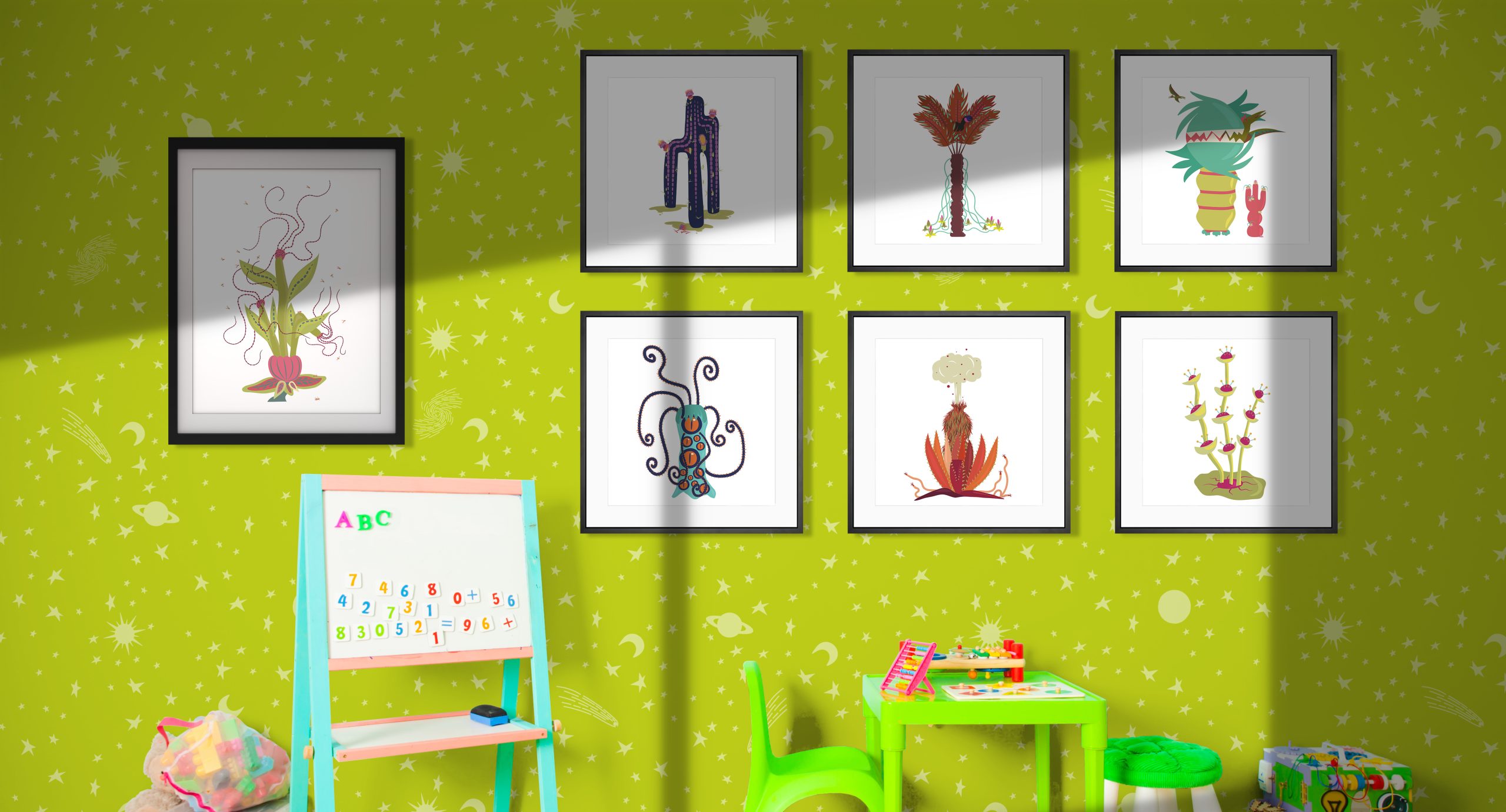 - Wallpaper: Transform your walls into a cosmic landscape with Other Worldly designs. The patterns add colour and excitement creating a fun backdrop to child’s bedroom or playroom or any room you choose!